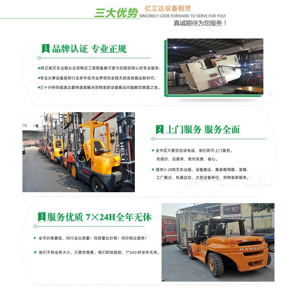 亿立达设备租赁有限公司是工商局准许的北京经济管理职业学院专业叉车出租公司,公司本着诚信、服务、效率、创新的经营理念,用精湛的技术,真诚的服务,为众多客户提供优质的服务,同时获得信赖与支持。专业提供北京经济管理职业学院3-20吨叉车出租、叉车租赁、设备搬运、集装箱掏箱装箱、机器移位定位、货物装卸、工厂搬迁、安全可靠,收费透明,价格便宜,随叫随到,24小时上门服务!本公司叉车吊车师傅对各种设备搬运装卸都有深刻探讨和研究。很多的疑难设备搬运,通过我公司的叉车师傅都能迎刃而解。对各种进口设备、国产机器、大型设备搬迁、高难度搬迁、各种精密仪器、医疗设备、科研设备等都能搬运; 提供全市 24 小时上门装卸搬运服务。同时提供厂房搬迁服务。 ...